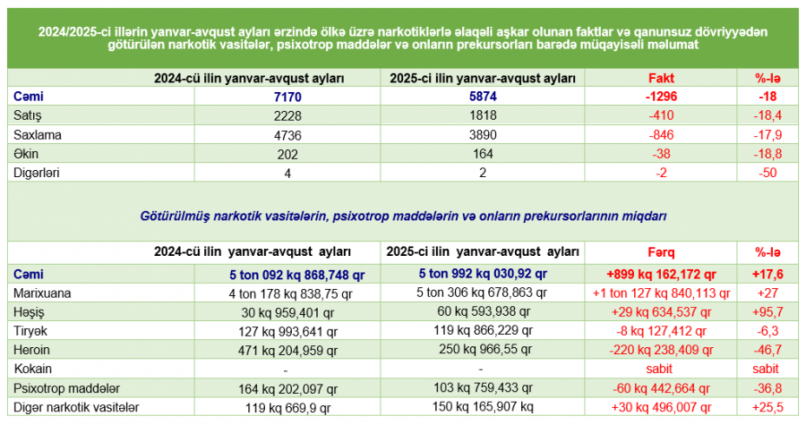 Təhlil göstərir ki, 2024-cü ilin yanvar-avqust ayları ilə müqayisədə cari ilin müvafiq dövrü ərzində narkotik vasitələrin və psixotrop maddələrin qanunsuz dövriyyəsi ilə bağlı hüquq mühafizə orqanları tərəfindən aşkar edilən faktların ümumi sayı 1296, qanunsuz satış ilə bağlı faktların sayı 410, satış məqsədi olmadan qanunsuz əldə edilib saxlanılması ilə əlaqədar faktların sayı 846, narkotik tərkibli bitkilərin qanunsuz kultivasiya edilməsi faktlarının sayı 38 bu kateqoriyadan olan digər cinayət faktlarının sayı 2, qaçaqmalçılıqla bağlı faktların sayı 4, qrup halında olan cinayətlərin sayı 53 fakt, məsuliyyətə cəlb olunmuş şəxslərin sayı 211 nəfər azalmışdır. Qanunsuz dövriyyədən çıxarılmış narkotiklərin çəkisi 899 kq 162,172qr artmışdır.