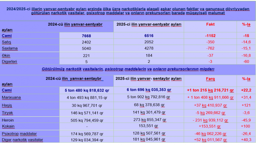 Təhlil göstərir ki, 2024-cü ilin yanvar-sentyabr ayları ilə müqayisədə cari ilin müvafiq dövrü ərzində narkotik vasitələrin və psixotrop maddələrin qanunsuz dövriyyəsi ilə bağlı hüquq mühafizə orqanları tərəfindən aşkar edilən faktların ümumi sayı1152, qanunsuz satış ilə bağlı faktların sayı 350, satış məqsədi olmadan qanunsuz əldə edilib saxlanılması ilə əlaqədar faktların sayı 762, narkotik tərkibli bitkilərin qanunsuz kultivasiya edilməsi faktlarının sayı 37 bu kateqoriyadan olan digər cinayət faktlarının sayı 3, qaçaqmalçılıqla bağlı faktların sayı 1, qrup halında olan cinayətlərin sayı 30 fakt, məsuliyyətə cəlb olunmuş şəxslərin sayı 1528 nəfər azalmışdır. Qanunsuz dövriyyədən çıxarılmış narkotiklərin çəkisi 1 ton 215 kq 216,721 qr artmışdır.