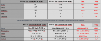 2025-ci ilin yanvar-fevral ayı ilə müqayisədə 2026-cı ilin müvafiq dövrü ərzində qanunsuz dövriyyədən çıxarılmış heroinin  çəkisi 3 kq 892,804 qr (3,8%), tiryəkin çəkisi 753,592 qr (2,3%) azalmışdır.